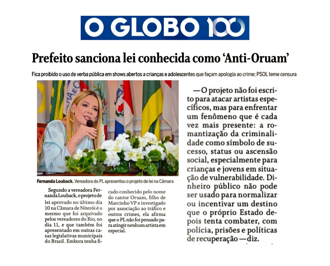 O prefeito de Niterói, Rodrigo Neves, sancionou a lei 57/2025, de autoria da vereadora Fernanda Louback (PL), conhecida como Lei "Anti-Oruam", que proíbe o uso de verba pública na contratação ou divulgação de espetáculos abertos a crianças e adolescentes que façam apologia ao crime ou ao uso de drogas.